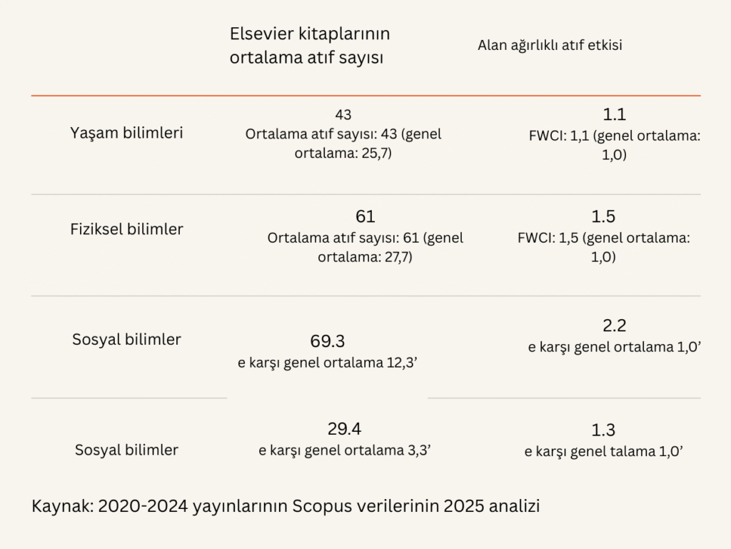 Elsevier kitaplarının yüksek ortalama atıf sayısı ve FWCI değerleri, yayınların kalitesini ortaya koymaktadır.